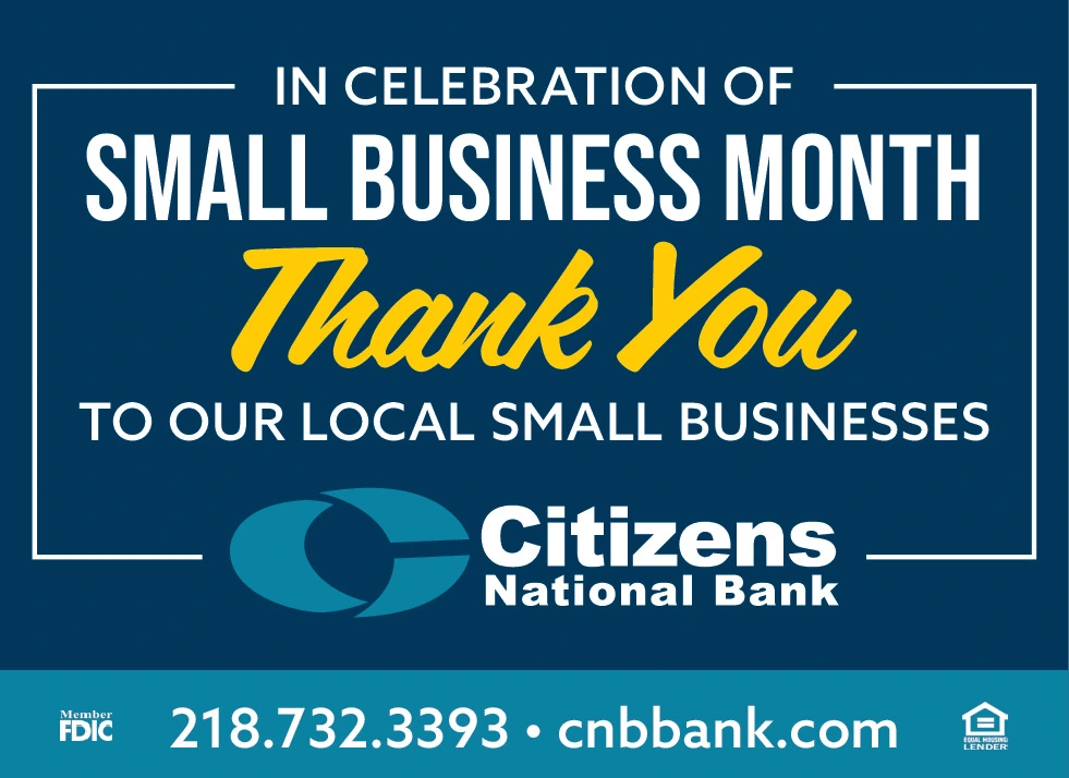 IN CELEBRATION OF SMALL BUSINESS MONTH Thank You TO OUR LOCAL SMALL BUSINESSES Citizens National Bank FDIC 218.732.3393 cnbbank.com LENDER IN CELEBRATION OF SMALL BUSINESS MONTH Thank You TO OUR LOCAL SMALL BUSINESSES Citizens National Bank FDIC 218.732.3393 cnbbank.com LENDER